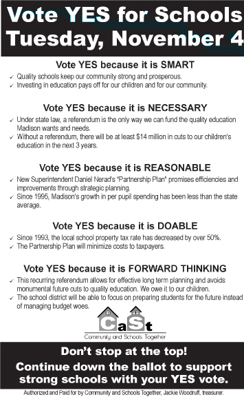 According to the official September census, the Madison Metropolitan School District serves 24,189 students. The individual and collective futures of these students are the best reasons to vote yes on the November 4 operating referendum.
