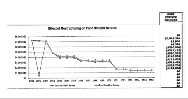 The biggest change (other than those related to reductions in anticipated revenue due to the the state budget and the addition of targeted ARRA funding) is in the refinancing and rescheduling of debt. The terms of this are already in place. It was done to realize real long-term savings and to provide property tax relief in 2009-10 by reducing the debt service levy by almost $6.8 million. If I read the document correctly, the real savings are $925,000 (maybe minus origination fees). This means that almost $6 million in debt has been shifted to later years. See this graph and part of a chart from the document.