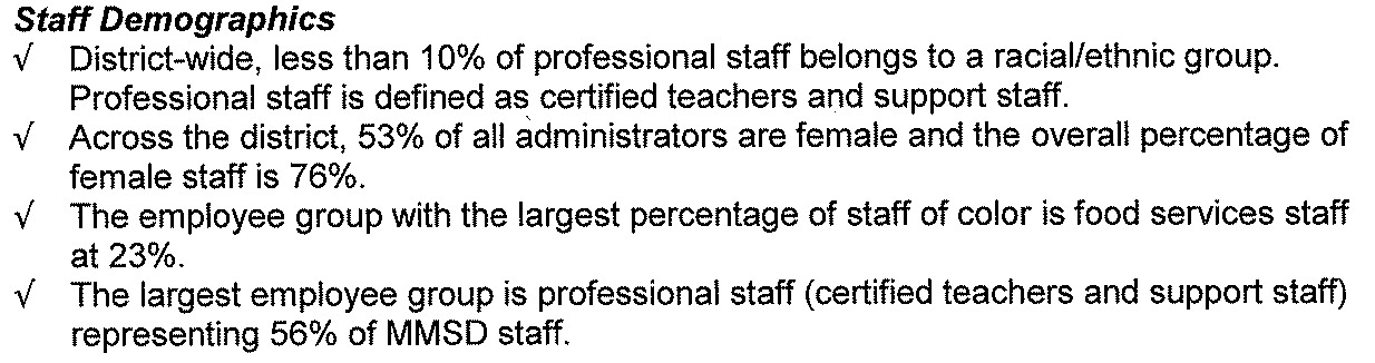 As I said above, the programmatic portion is a positive thing. The staff and financial parts are another story. Instead of looking at the staffing at particular schools (as was done for middle schools in 2006) or reports on diversity in various jobs or schools (there was a Human Resources Report about 6 months ago that did the former, I’ll link to it when I get a chance) we get this:
