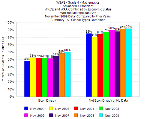 Note: For a while, I’m going to be illustrating the “On the Agenda” posts with various graphs documenting achievement gaps in MMSD as revealed by the admittedly flawed and limited WSAS/WKCE results. I think regular reminders may do some good. Note also that despite recent progress, 32 point gap remains between children in poverty and those more economically secure.