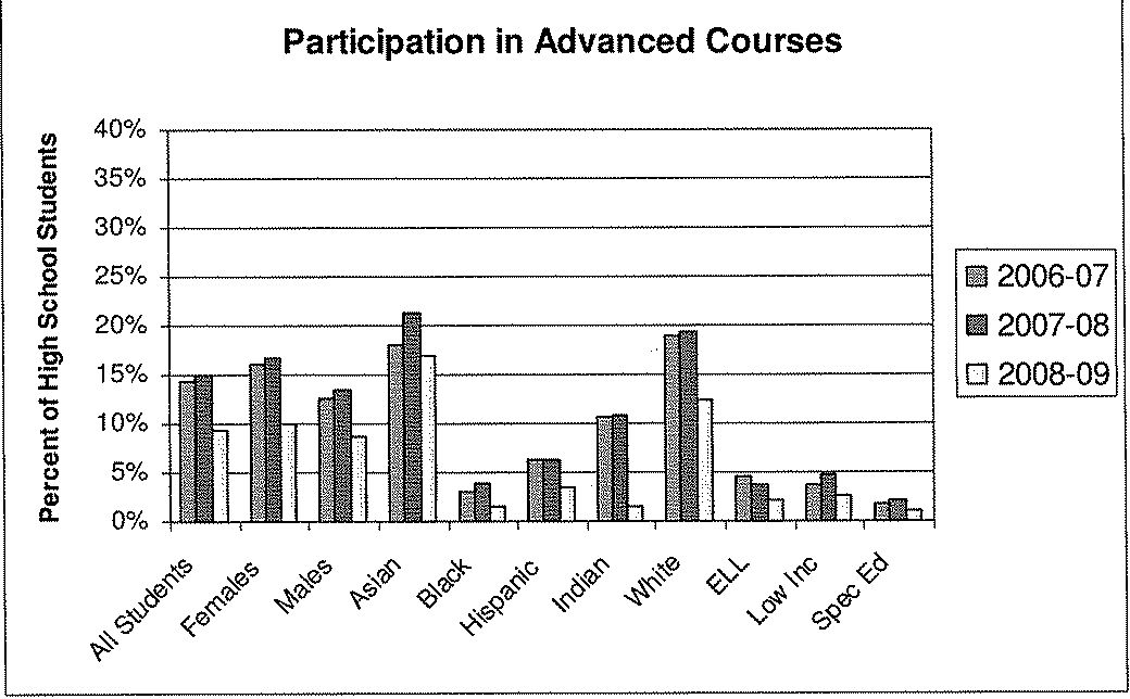 Two notes before going deeper on this. First, “advanced courses” isn’t defined and second, the graph without data makes it very hard to know what is happening with the demographics.