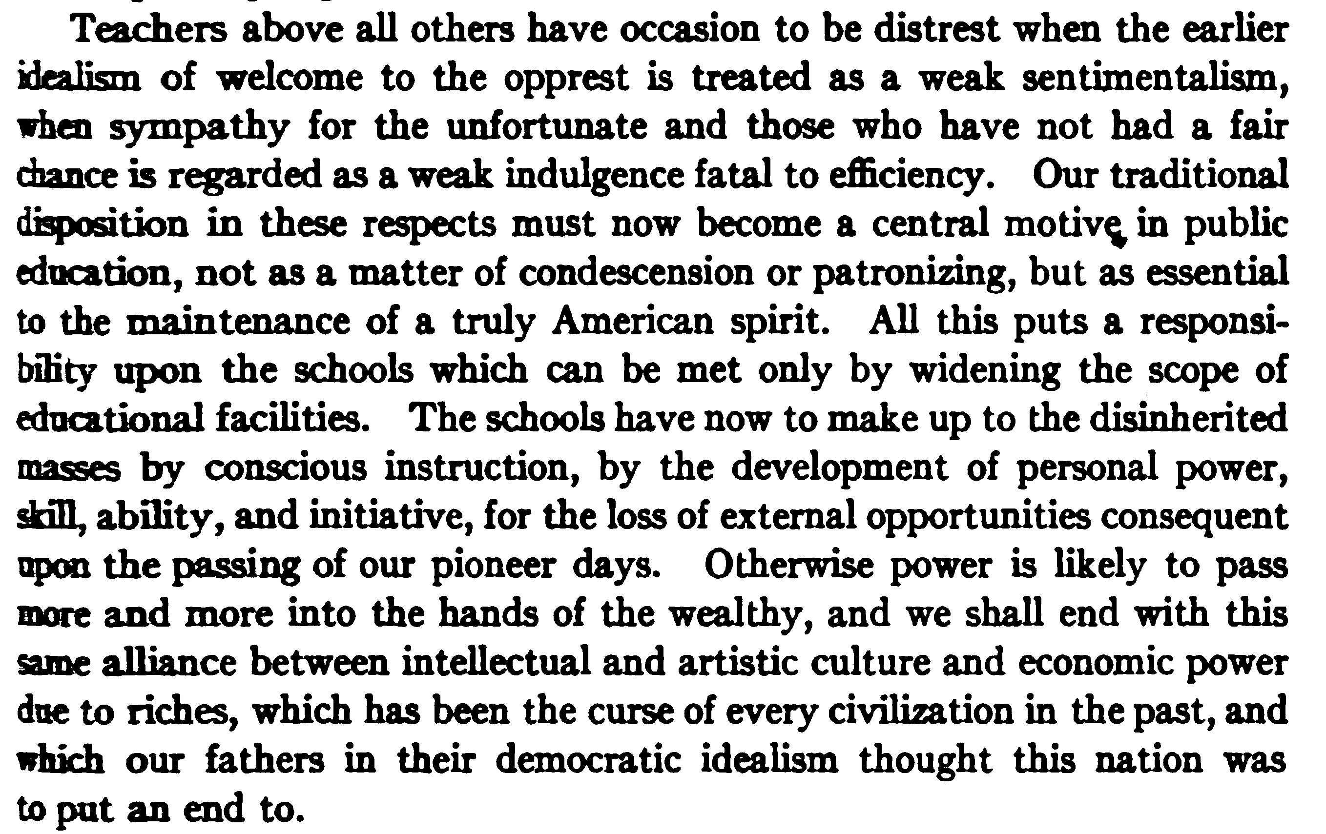 This is the first in a new series on AMPS: Blasts from the Past.  It will be devoted to historical materials that comment on or illuminate contemporary issues in education.  I’ll usually  also post some links to recent, related things and often a song too.  I’m a historian by training, so I feel compelled to say that historical analogs should always be carefully examined, developments in the past are never identical to developments in the present.  Both continuity and change should be assessed.  In this series the emphasis will be on continuity, but I realize that’s only part of the picture.